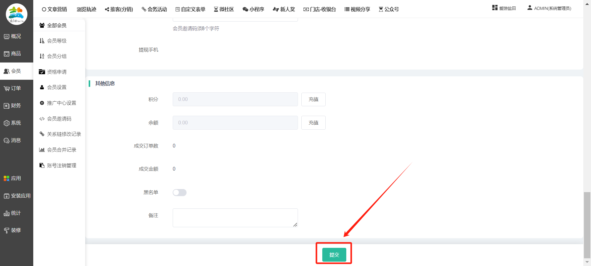 目录 搜索 展开 一、前期准备资料二、数字乡村码-上线操作指南1、服务号的申请流程及认证2、申请小程序流程3、开放平台绑定小程序和公众号三、数字乡村码-系统操作数字乡村码系统管理-概况数字乡村码-商品管理1、发布商品2、商品列表3、商品表单4、商品分类5、品牌管理6、配送模板7、评论管理8、优惠券管理9、商品标签10、退货地址设置11、满额优惠12、批量操作13、配送方式14、基础设置15、商品隐藏四、数字乡村码-会员管理1、全部会员2、会员等级3、会员分组4、资格申请5、会员设置6、推广中心设置7、会员邀请码8、会员关系链修改关系链修改记录9、会员合并记录10、账号注销管理11、会员设置中心五、数字乡村码-订单管理1、订单管理列表2、订单处理流程3、订单状态4、订单修改价格5、订单退款退货6、多包裹发货7、批量发货订单操作步骤8、催发货订单9、物流查询六、数字乡村码-财务管理1、余额设置2、会员余额3、充值记录4、转让记录5、余额明细6、收入明细7、提现设置8、提现统计9、积分管理10、转账审核11、收益广告12、批量充值七、数字乡村码-系统管理1、商城入口2、商城设置①、商城设置②、订单设置③、物流查询④、短信⑤、联系方式⑥、分类⑦、优惠券⑧、分享⑨、幻灯片⑩、广告位⑫、地图设置3、交易设置4、微信模板消息自定义消息模板(新版)自定义消息模板(旧版)小程序消息模板公众号模板消息变更公告5、语言设置6、权限管理7、多媒体管理八、数字乡村码-消息管理九、数字乡村码-应用管理十、数字乡村码系统-数据统计十一、数字乡村码-页面装修DIY1、模板管理2、店铺页面3、顶部导航4、底部导航5、DIY模板市场6、首屏广告7、基础设置8、装修DIY尺寸建议十二、供应商功能插件操作指南1、供应商2、门店-收银台门店申请和使用步骤门店管理①、门店-收银台 营销设置②、门店-收银台 分润设置门店分类门店申请门店审核门店商品门店商品订单收银台订单数据统计核销员基础设置默认设置门店装修3、微社区4、会务活动十三、营销插件操作指南活动报名提货卡新人奖微店问卷调查积分视频分享1、视频分享基础设置2、视频分享发现管理3、视频分享分类管理4、视频分享评论管理5、视频分享分红记录6、视频分享短视频中心每日红包幸运大抽奖签到优惠券二维码任务奖励优惠劵文章音频文章付费文章限时购新海报拓客卡操作流程积分活动素材中心视频红包十四、入驻门店应用类1、门店预约2、附近商品3、门店定位设置4、门店控制5、门店满额包邮6、门店满额减7、导入商品8、门店搜索9、门店股东10、核销券11、多门店核销1、商城后台设置2、前端功能演示十五、常见问题1、后台登录密码修改流程2、会员-余额,积分,后台如何进行充值与扣除3、如何修改上下级关系4、一种万能的获取商城小程序路径的方法 暂无相关搜索结果! 阅读次数:1739 本文档使用 模王系统 发布 8、会员关系链修改 8、会员关系链修改一.如何修改上下级关系?1.会员-全部会员-可以通过搜索用户的独立ID,或者用户微信昵称,找到此会员,然后点击右边的(操作)2.再点击会员详情。3.滑到下面,有个推广信息-会员上线,点击修改4.输入上级的ID号,点击搜索,出来此上级会员后点击选择。5.滑到最下面,一定要点击提交按钮。文档更新时间: 2023-11-30 14:56 作者:链上旅行