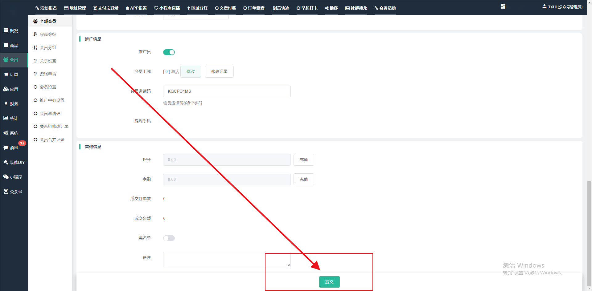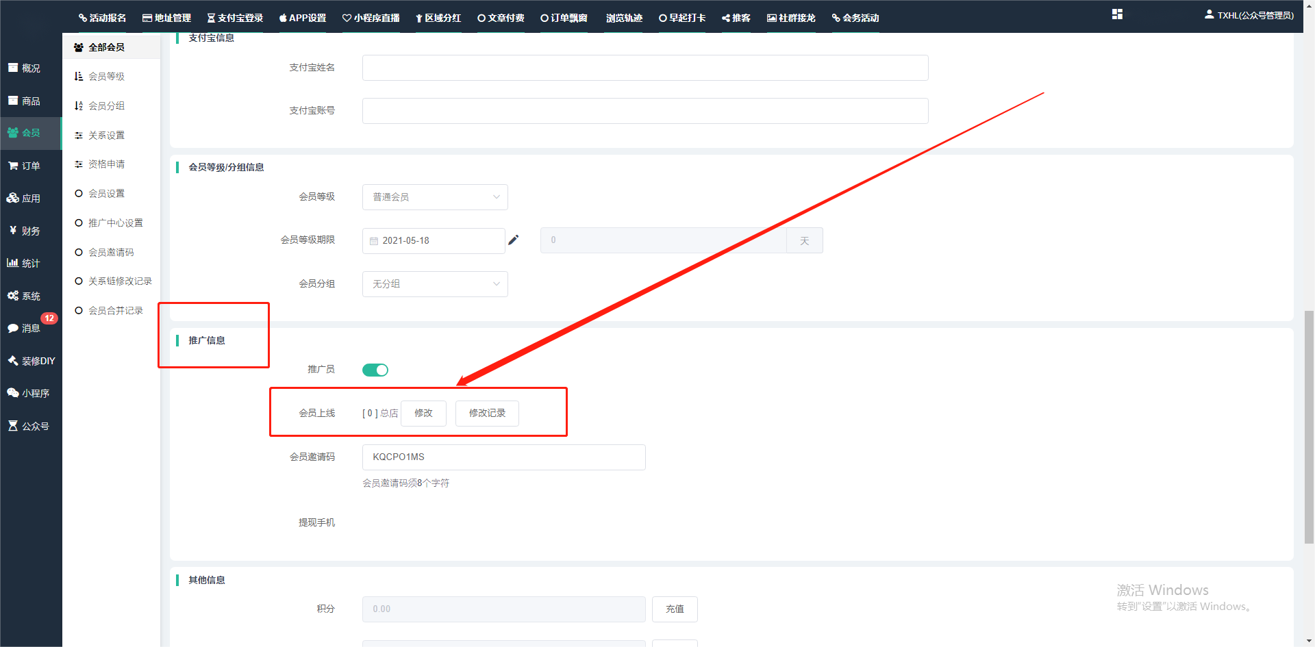 目录 搜索 展开 一、前期准备资料二、数字乡村码-上线操作指南1、服务号的申请流程及认证2、申请小程序流程3、开放平台绑定小程序和公众号三、数字乡村码-系统操作数字乡村码系统管理-概况数字乡村码-商品管理1、发布商品2、商品列表3、商品表单4、商品分类5、品牌管理6、配送模板7、评论管理8、优惠券管理9、商品标签10、退货地址设置11、满额优惠12、批量操作13、配送方式14、基础设置15、商品隐藏四、数字乡村码-会员管理1、全部会员2、会员等级3、会员分组4、资格申请5、会员设置6、推广中心设置7、会员邀请码8、会员关系链修改关系链修改记录9、会员合并记录10、账号注销管理11、会员设置中心五、数字乡村码-订单管理1、订单管理列表2、订单处理流程3、订单状态4、订单修改价格5、订单退款退货6、多包裹发货7、批量发货订单操作步骤8、催发货订单9、物流查询六、数字乡村码-财务管理1、余额设置2、会员余额3、充值记录4、转让记录5、余额明细6、收入明细7、提现设置8、提现统计9、积分管理10、转账审核11、收益广告12、批量充值七、数字乡村码-系统管理1、商城入口2、商城设置①、商城设置②、订单设置③、物流查询④、短信⑤、联系方式⑥、分类⑦、优惠券⑧、分享⑨、幻灯片⑩、广告位⑫、地图设置3、交易设置4、微信模板消息自定义消息模板(新版)自定义消息模板(旧版)小程序消息模板公众号模板消息变更公告5、语言设置6、权限管理7、多媒体管理八、数字乡村码-消息管理九、数字乡村码-应用管理十、数字乡村码系统-数据统计十一、数字乡村码-页面装修DIY1、模板管理2、店铺页面3、顶部导航4、底部导航5、DIY模板市场6、首屏广告7、基础设置8、装修DIY尺寸建议十二、供应商功能插件操作指南1、供应商2、门店-收银台门店申请和使用步骤门店管理①、门店-收银台 营销设置②、门店-收银台 分润设置门店分类门店申请门店审核门店商品门店商品订单收银台订单数据统计核销员基础设置默认设置门店装修3、微社区4、会务活动十三、营销插件操作指南活动报名提货卡新人奖微店问卷调查积分视频分享1、视频分享基础设置2、视频分享发现管理3、视频分享分类管理4、视频分享评论管理5、视频分享分红记录6、视频分享短视频中心每日红包幸运大抽奖签到优惠券二维码任务奖励优惠劵文章音频文章付费文章限时购新海报拓客卡操作流程积分活动素材中心视频红包十四、入驻门店应用类1、门店预约2、附近商品3、门店定位设置4、门店控制5、门店满额包邮6、门店满额减7、导入商品8、门店搜索9、门店股东10、核销券11、多门店核销1、商城后台设置2、前端功能演示十五、常见问题1、后台登录密码修改流程2、会员-余额,积分,后台如何进行充值与扣除3、如何修改上下级关系4、一种万能的获取商城小程序路径的方法 暂无相关搜索结果! 阅读次数:1665 本文档使用 模王系统 发布 3、如何修改上下级关系 如何修改上下级关系一.如何修改上下级关系?1.会员-全部会员-可以通过搜索用户的独立ID,或者用户微信昵称,找到此会员,然后点击右边的(操作)2.再点击会员详情。3.滑到下面,有个推广信息-会员上线,点击修改4.输入上级的ID号,点击搜索,出来此上级会员后点击选择。5.滑到最下面,一定要点击提交按钮。文档更新时间: 2024-01-05 14:50 作者:链上旅行